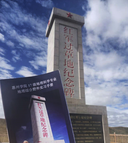 时间回到1936年7月底,红二、四方面军左路纵队从阿坝出发经红原(1960年7月周恩来总理题词“红军长征走过的大草原”,命名该地为“红原”)度过嘎曲,踏上了征服泽国草地的艰难历程。因海拔高、环境恶劣、物资紧缺,许多红军战士因饥饿、寒冷、伤病牺牲在草原沼泽中……84年之后,惠州学院的地理综合野外实习队伍追随红军的脚步,从日干乔草原湿地徒步攀登至海拔为3495米的山顶,来到了“红军过草地纪念碑”下。同学们从惠州长途跋涉了5000公里后,终于见到了实习手册的封面图。虽有部分师生有轻微高原反应,但都坚持了下来,无一人掉队。尔后大家参观了川主寺红军长征纪念馆。