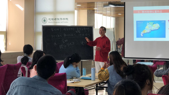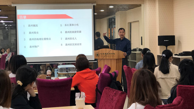 何克勤先生以“新客家,老客家,来到惠州就是一家;本地人,外地人,在惠州工作就是惠州人”为开头,让学生感受惠州的热情好客,随后从惠州概况、惠州简史、惠州地理位置特点、惠州物产、东江菜和小吃、惠州旅游资源、惠州名人、惠州发展前景八个方面为学生详细介绍了惠州的情况。同时,他还向大家展示了一个好导游必不可少的技能——唱歌。他告诉大家,导游要掌握的这个歌唱技能不仅仅是唱歌那么简单,而是要把导游词、欢迎词等融入到歌曲当中。为了活跃课堂气氛,激发同学们对惠州文化的兴趣,何克勤先生列出了几个惠州本地话的谜语让学生玩猜猜猜。