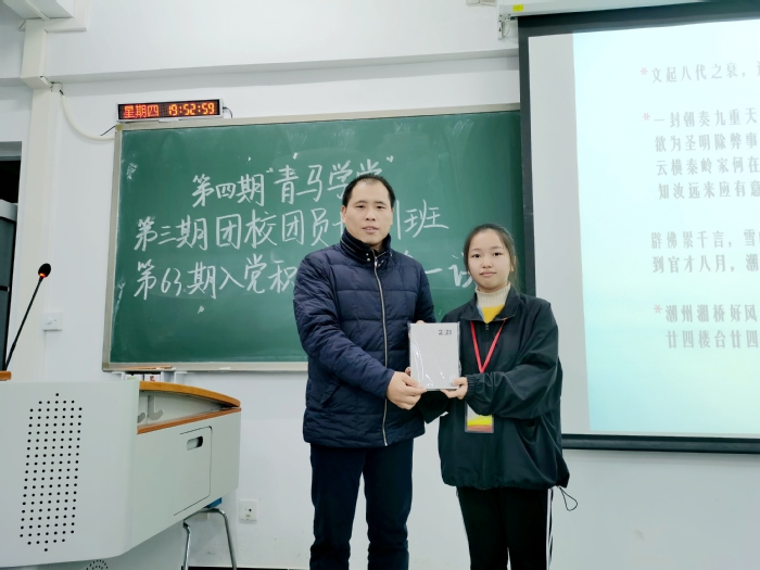 地旅学院党总支副书记罗辉武为分享家乡故事的同学赠送小礼物