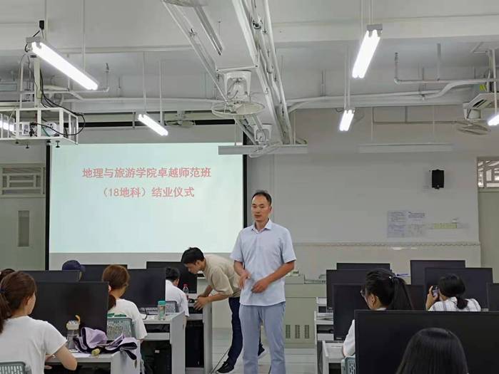 7月2号上午,地理与旅游学院在教学实验楼1301举行了卓越师范班结业仪式。学院副院长王丰年、地理科学系主任蒋宝林和师范班指导老师大赛指导老师刘淑华、霍祎黎、董超阁和叶志平老师出席此次结业仪式。结业仪式由叶志平老师主持。