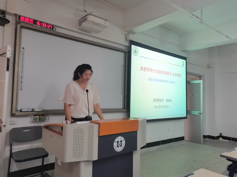 董琳琳老师首先对2021版旅游管理专业人才培养方案进行了解读,主要从旅游管理专业办学历史、人才培养目标、课程体系设置、校内外实践设施等方面进行了详细的介绍,并着重对体验管理方向进行了设置背景、目标及课程构成的解读,希望同学们能够把握旅游产业和社会经济发展动向,努力学好、用好专业知识,筑造每位同学美好的明天。