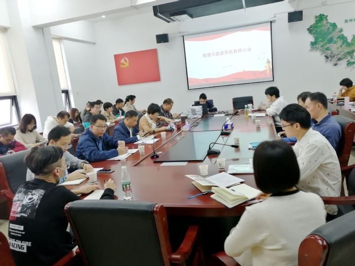 11月17日,地理与旅游学院在该学院会议室组织召开全院教师大会集中学习党的十九届六中全会精神,集中学习会由该学院党总支书记林红主持。
