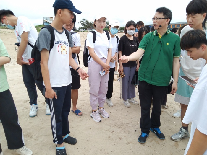 同学们首先来到双月湾——红海湾和平海湾沙滩,并在老师们的讲解下,了解了双月湾景观的形成原因:由于大星山阻挡了来外侧海浪,使得向陆的一面形成波影区,波影区浪能较弱,泥沙堆积便形成了红海湾。来自红海湾方向海流带来的堆积物逐渐延伸至大星山,形成连岛坝。来自平海湾海流带来的泥沙也逐渐延伸形成拦湾坝。连岛坝与拦湾坝形成了美丽的双月湾自然景观。河流、潟湖与海洋共同作用形成的平地与滩涂湿地,为人类聚落的形成提供了得天独厚的自然条件。