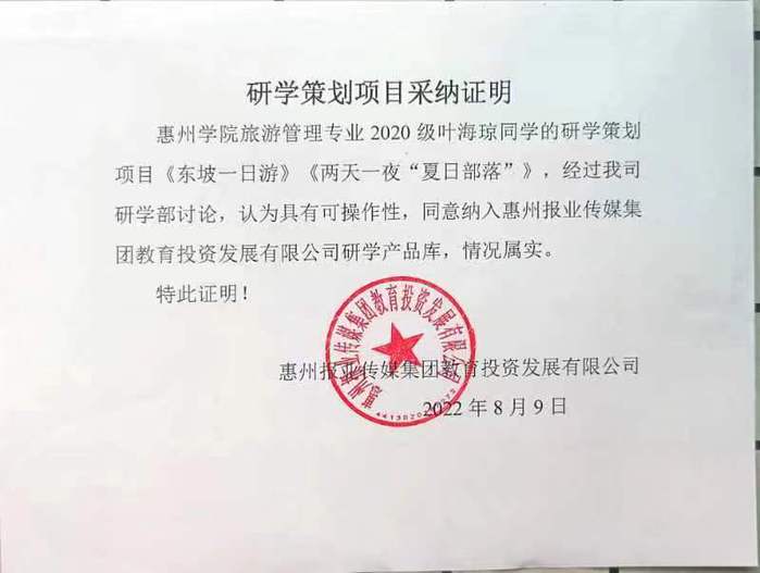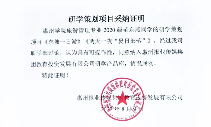 近日,接惠州报业传媒集团教育发展有限公司通知,经该公司研学部讨论,我院旅游管理专业2020级范东燕、叶海琼两位同学设计的研学项目《东坡一日游》《夏日部落》由于具有可操作性,已经纳入该公司研学产品库。