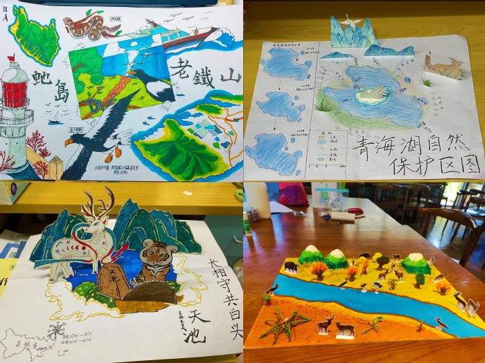 选手作品表现形式各异,创意丰富:“三三两两队”以保护对象为创作中心,通过湖区面积变化体现环境保护效果的青海湖地图;“啊对对队”通过多层不同表现形式地图堆叠体现立体感的蛇岛—老铁山地图;“保卫马鹿队”以2D与3D视觉效果相结合的塔里木河创意沙盘;“农夫三拳队”长白山天池地图则以长相守共白头表达希望人与动物长久和谐相处于美好的大自然里的美好寓意等优秀作品。在各个方面都有突出表现,展示了参赛同学的多才多艺以及对生态环境建设的深刻理解。
