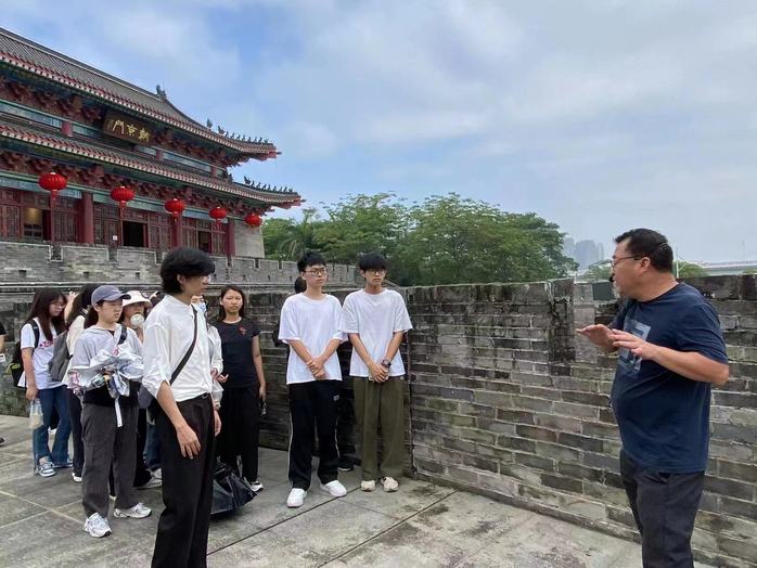 同学们在带队老师的引领下,沿着朝京门新旧城墙古道一路前往北门直街、中山纪念堂,途经文笔塔、合江楼、水东街、惠新东街、东湖旅店、白鹤峰、东坡祠等人文景点。简老师一路给同学们讲解沿途的典故,让这些只存在于书本上的历史故事在同学们心中都鲜活了起来。行程的最后一站是东坡祠和东坡纪念馆,这里曾经是苏东坡的故居,东坡井、林婆酒肆等遗迹记录了苏轼在惠州期间的颠沛与豁达。作为曾经的归善县城,桥东老街、北门直街、水东街骑楼见证了一个时代的繁华,老街的古民居处处散发着历史的幽香。