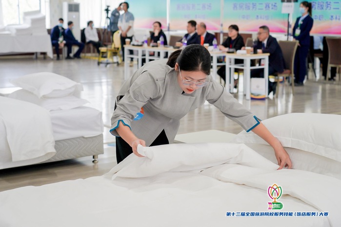 本次大赛共有来自全国29个省、自治区、直辖市的344所院校参赛队的1035名选手参赛,设有中餐宴会摆台、西餐宴会摆台、中式铺床和鸡尾酒调制四个赛项,参赛选手从综合理论知识考核、英语水平测试和现场操作三个环节展开角逐。我院四名同学在学院的支持鼓励下,在刘恩波、张耿嵩、张翠苹、董琳琳、纪思薇五位老师的悉心指导下,经过数月的集训打磨,最终捧杯而归,为建设旅游管理国家一流本科专业添砖加瓦。