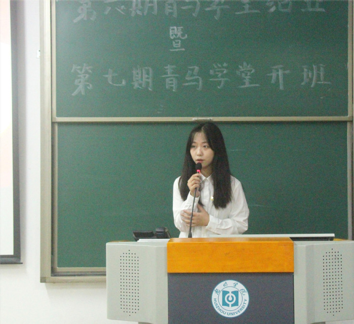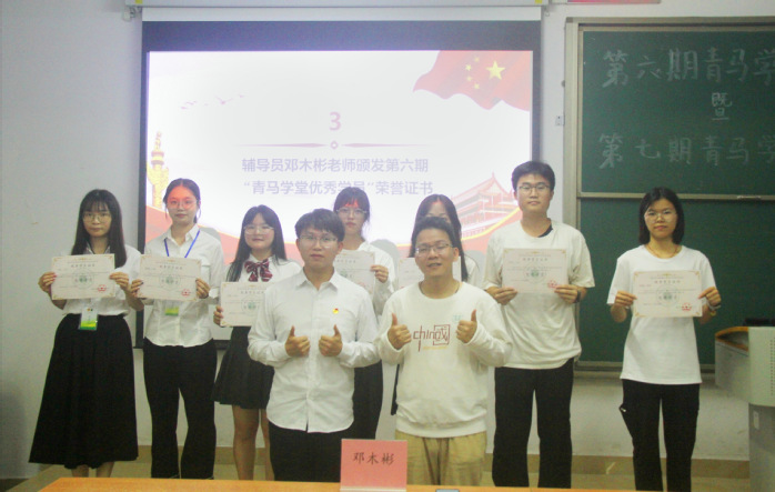 在两期学员的见证下,团委书记邓木彬为第六期青马学堂优秀学员颁发了荣誉证书,随后第六期青马学堂优秀学员代表莫紫凝上台发言。她提到,青马班是一个全面提升个人综合素质的平台,不仅能让大家够学习丰富的知识和技能,还能帮助大家树立正确的人生观和价值观。她指出,青马培训让自己深刻认识到了团队协作的重要性,让自己在学业上取得了更优异的成绩,更让自己明白了在未来的职业生涯中,只有团结一致才能战胜一切挑战。她呼吁在场同学,作为一名青年大学生,应该肩负起时代赋予我们的责任和使命,希望新一届青马班的成员珍惜学习机会,不断努力提高自己的综合素质希望第六期青马学堂学员保持联系,相互学习,共同为祖国的繁荣和发展贡献自己的力量。