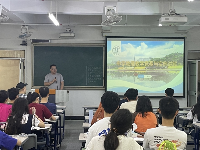 开班仪式结束后,由惠州市优秀教师韩涛老师进行《中学地理教学竞赛与实例讲解》主题讲座,从评价标准、理论准备、选题技巧、方案设计、典例赏析五个方面向同学讲授如何设计中学地理教学课堂,在教学竞赛中出类拔萃。韩老师以生动有趣的讲解方式,结合着自己在教学中所观察或参与到其中的实例向同学们提出宝贵的经验,同学们受益匪浅。