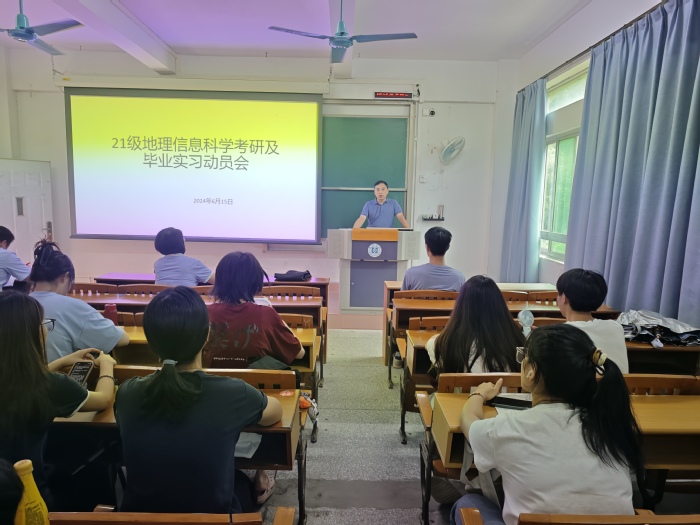 6月14日,地理信息科学系在电子楼308举行21级地理信息科学考研及毕业实习动员会。学院院长戴学军、党委副书记祝琳、地理信息科学系全体教师、辅导员邓木彬老师以及21地信全体同学出席,会议由地理信息科学系系主任陈金星主持。