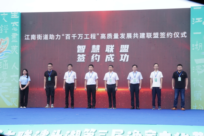 “百千万工程”需要凝聚各方力量深度参与,随着全面推进“百千万工程”,江南街道创新推出了“百千万工程”共建联盟,从不同角度整合社会资源、激发社会活力、凝聚社会共识。开幕式现场,江南街道携手7个联盟(分别为政协委员联盟、人大代表联盟、统战联盟、智慧联盟、商业联盟、乡贤联盟、文化联盟),进行共建联盟签约仪式。其中智慧联盟主要依托当地院校,我院副院长吴鹏豹代表学院与江南街道进行了合作签约,主要为后续江南街道“百千万工程”提供技术支持、智力支持和人力支持。