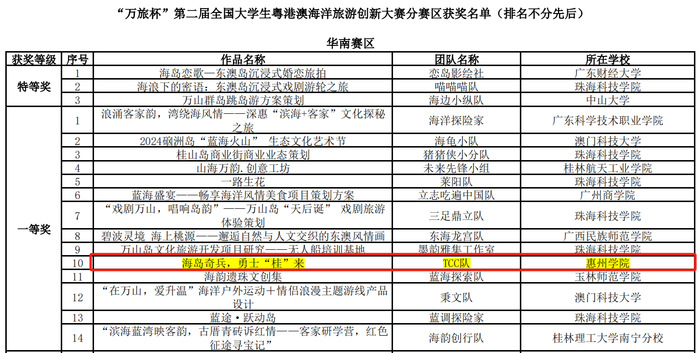 11月5日,中国旅游协会旅游教育分会主办的“万旅杯”第二届全国大学生粤港澳海洋旅游创新大赛初赛揭晓,李颜老师指导,22级地理信息科学唐家园(队长)和陈佳铄、22网络新媒体陈燕三位同学组成的TCC队作品《海岛奇兵,勇士“桂”来——桂山岛红色旅游项目策划》获华南赛区一等奖。本次大赛共吸引了全国193所高校、557支队伍、3200余名师生报名。组委会组织评委按照华南、华北、华东、西北、西南、东北、华中共七个赛区进行了评审,按照各赛区提交作品数量的10%、20%、30%的比例评选出各分赛区一等奖、二等奖和三等奖。