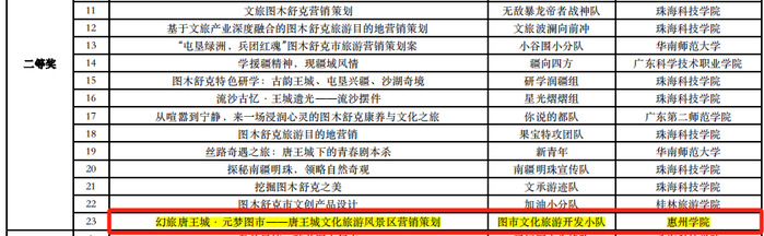 11月11日,中国旅游协会旅游教育分会主办的2024全国大学生“梦回唐王城,醉美永安湖”文旅创新大赛初赛揭晓,李颜老师指导,23旅游管理蔡肜宜(队长)、23地理信息科学张俊琪和曾菲菲、23产品设计朱敏杰四位同学组成的图市文化旅游开发小队作品《幻旅唐王城·元梦图市——唐王城文化旅游风景区营销策划》获华南赛区二等奖。本次大赛共吸引了全国96所高校、338支队伍、2000余名师生报名。组委会组织评委按照华南、华北、华东、西北、西南、东北、华中共七个赛区进行了评审,按照各赛区提交作品数量的10%、20%、30%的比例评选出各分赛区一等奖、二等奖和三等奖。