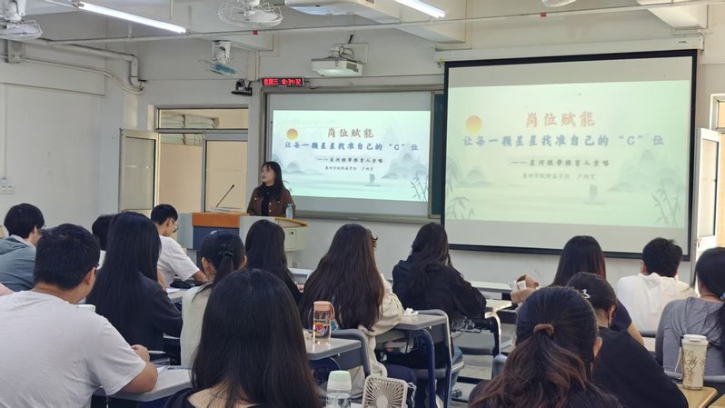 卢绮雯结合自身丰富的班主任工作经验,以“星河班带班育人方略”为主题,系统阐述了独具特色的班级管理理念与实践方法。她以“星河”为喻,强调班级建设应如星河般既有整体凝聚共识性,又要尊重学生的个体差异性因材施教。她分别从班风建设、学风引导、学生个体关怀、家校沟通协作等多个维度,分享了具体个案案例与行之有效的应对策略,为未来可能走向教师岗位的同学们提供了宝贵的经验借鉴与思想启发。除了班级管理经验的倾囊相授,卢绮雯特地为同学们细致讲解了“怎样备考教师招聘”的详细策略。内容涵盖政策解读、备考流程、笔试与面试的关键技巧、岗位选择建议以及备考期间的心理调适等方面。她的讲解深入浅出、条理清晰,有效解答了同学们对于教师编制考试的诸多疑惑,为他们明确了备考方向,也增强了应试自信心。
