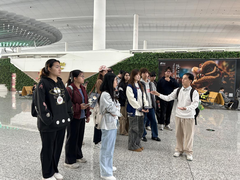 见习活动以“理论铺垫+现场实操”的模式有序开展。在前往机场的途中,陈光宝结合自身从业经验,为同学们系统梳理了导游带团全流程服务规范,重点讲解行前准备、接站安排、日程核对与确认等核心要点,并对学生回答的问题进行细致的点评与指导。随后,在广州白云国际机场T2航站楼开展现场教学活动,陈光宝带领同学们逐一熟悉值机柜台分布,详细说明办理登机手续的标准流程、接送机操作规范、行李寄存步骤、随身物品携带要求以及特殊事件处理的方法,并分享了带飞机团时的注意事项与实践经验。