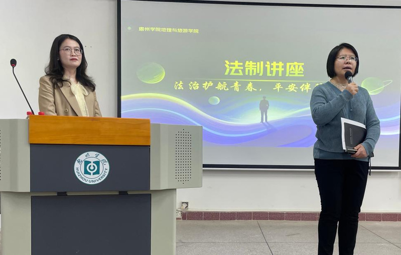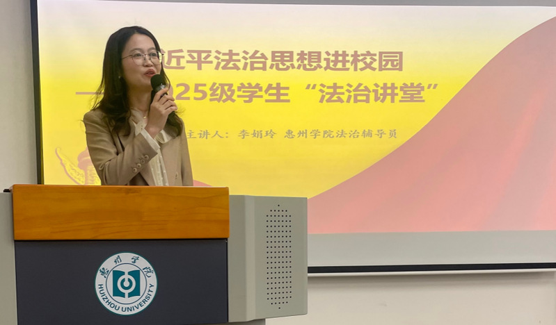 为深入学习贯彻习近平法治思想,推进“法治进校园”,12月10日,惠州学院地理与旅游学院在田家炳楼220教室为2025级新生举办“法治讲堂”。学院特邀法制辅导员、广东人为律师事务所律师李娟玲主讲,党委副书记祝琳、辅导员王培培及240余名新生参与,助力学子强化法治观念。