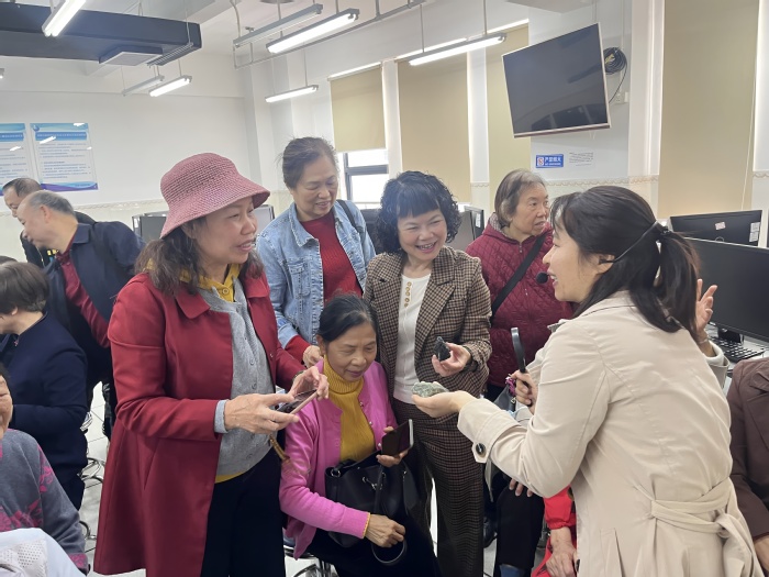 随后,大家移步至科技大楼B座地理与旅游学院实验室。实验员彭雪桃首先介绍了学院的办学历史与专业特色。在地质标本陈列区,丰富的岩石与矿物标本引起了老师们的浓厚兴趣。地理信息科学专业副教授尹辉与实验员彭雪桃共同带领退休教师开启了一场以“探秘岩石世界,感受地质魅力”为主题的地理科普课。活动中,退休教师们仔细观察岩石纹理,认真聆听矿物形成与地质演变讲解,并联系生活实际踊跃交流,现场气氛热烈,学科魅力深入人心。