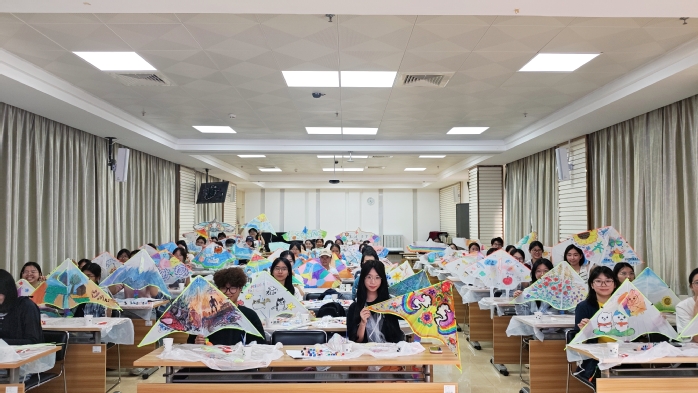 继教院培训室内,空白风筝与缤纷颜料整齐铺展,参与者们或伏案细描,或挥洒涂鸦,以“春日花草”与“情绪涂鸦”为主题,将内心的喜怒哀乐化作笔下的色彩。有的同学用明快的向日葵表达对阳光的向往,有的则以抽象的线条勾勒出近日的心绪起伏。完成创作后,大家纷纷将独一无二的风筝送上蓝天,一时间,广场上空彩鸢翩跹,与春日的暖阳交相辉映。